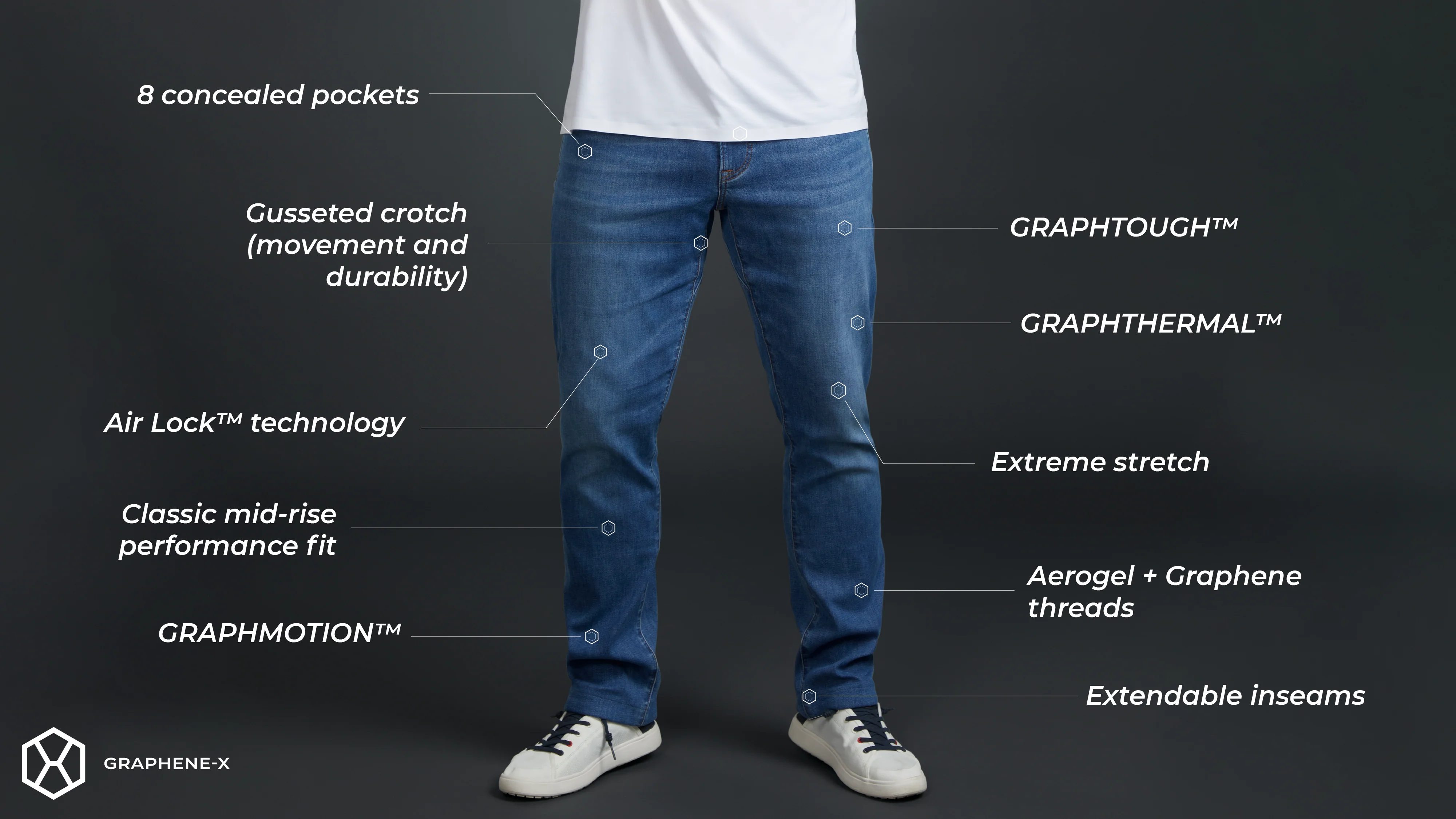 The AeroGraph Denim Jeans fuse graphene, aerogel, and Air Lock™ technology developed by one of the oldest denim mills in the world.