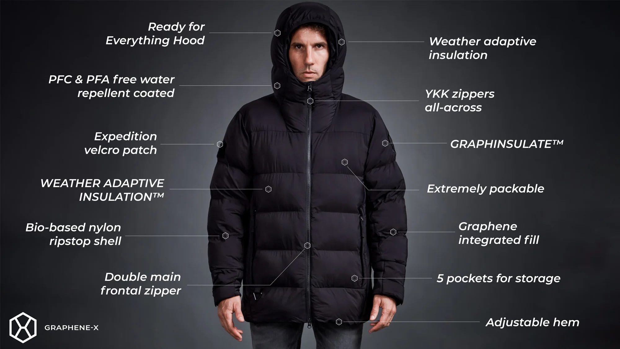 The AeroGraph Puffer Jacket is engineered to excel in temperatures ranging from -20°C (-4°F) to +20°C (68°F), thanks to our innovative Weather Adaptive Insulation™ technology. This aerogel-based insulation dynamically adjusts in real-time to changing temperatures. Featuring just 160 grams of graphene-integrated fill and a bio-based shell, the jacket delivers exceptional performance without the bulk.
