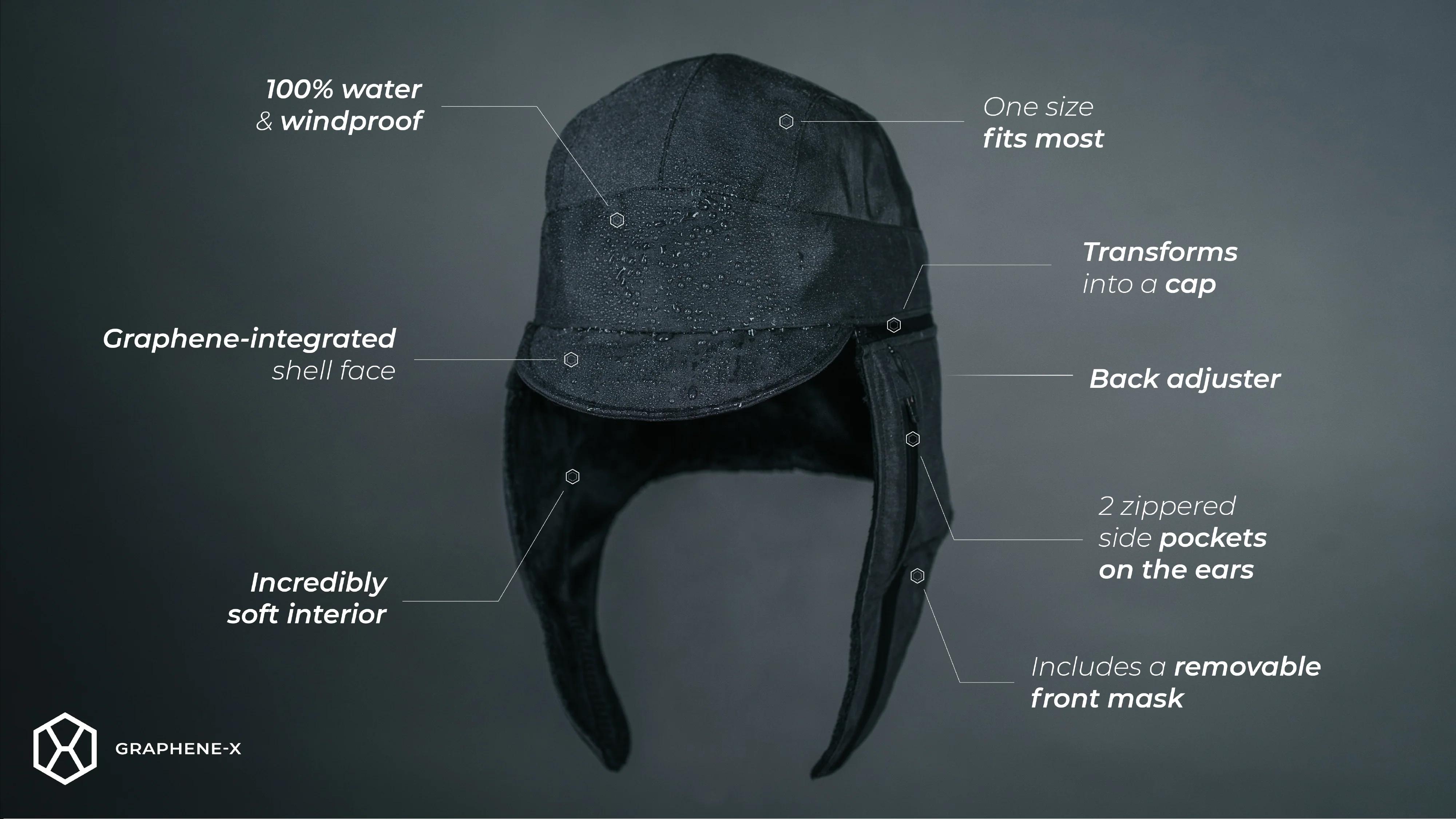 The Expedition Hat uses a graphene-integrated 3-layer fabric with a 10k⁄10k waterproof-breathable membrane to keep you dry and protected. It converts to a cap in seconds and includes a detachable, adjustable face mask for severe cold or added coverage. Two discreet zip pockets at the ears provide EDC storage. Fit is one-size with a rear hook-and-loop adjuster, and a reflective strip for low-light visibility. Inside is soft and insulated for comfort in harsh weather.