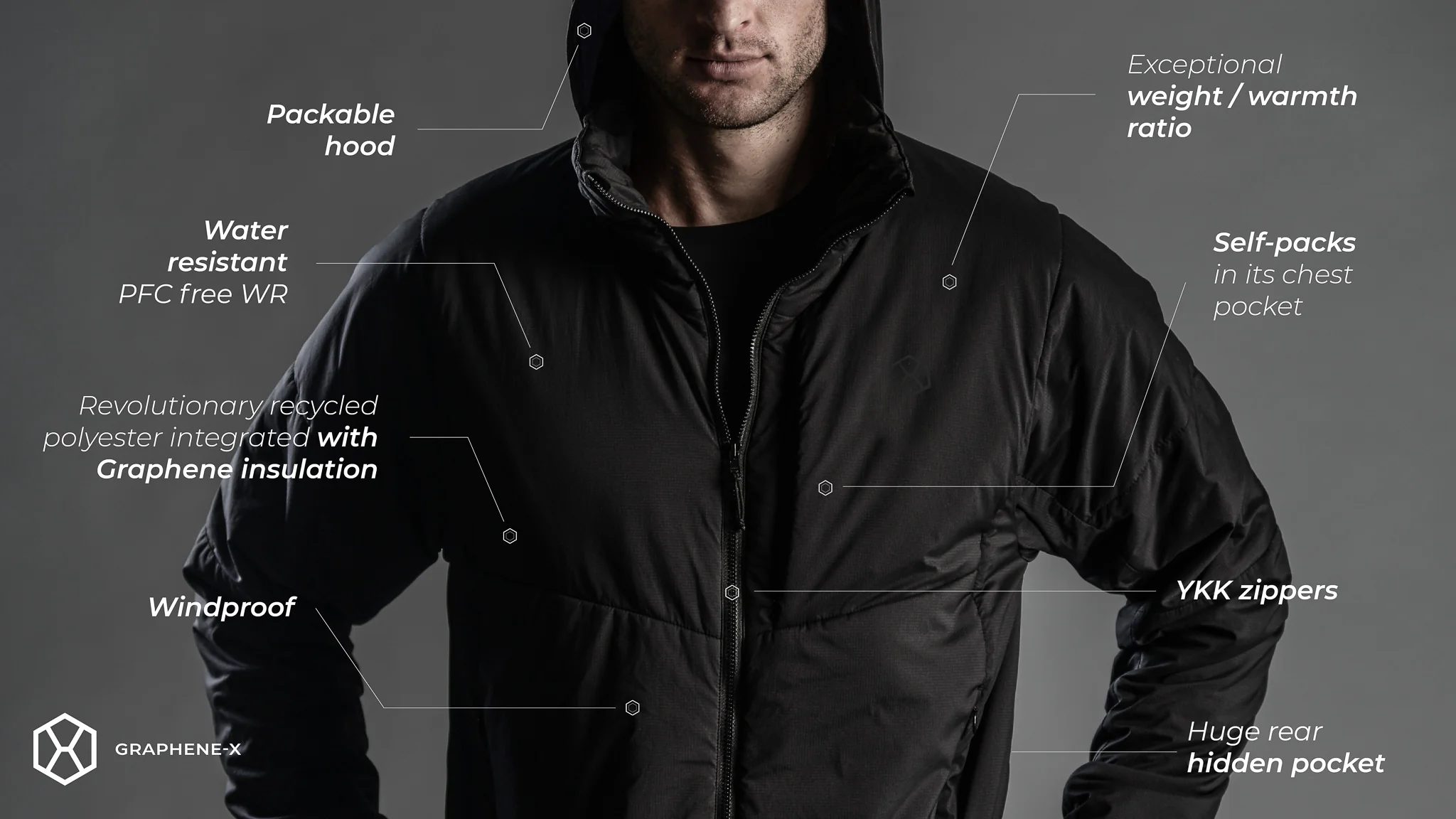 The GRAnaREC Midlayer Jacket redefines insulation. Built with GRAPHINSULATE™, a first-ever graphene-integrated recycled polyester fill, it delivers an unrivaled weight-to-warmth ratio that keeps you warm even when wet. It self-packs into its own chest pocket, making it easy to carry everywhere. Available in 80 g/m² (Black) for colder seasons and 60 g/m² (Ice Grey) for milder climates. With water-resistant PFC-free coating, windproof performance, antibacterial and anti-UV properties, plus abundant storage including a hidden rear pocket and packable hood, the GRAnaREC is the midlayer built for everything from urban nights to unpredictable trails.