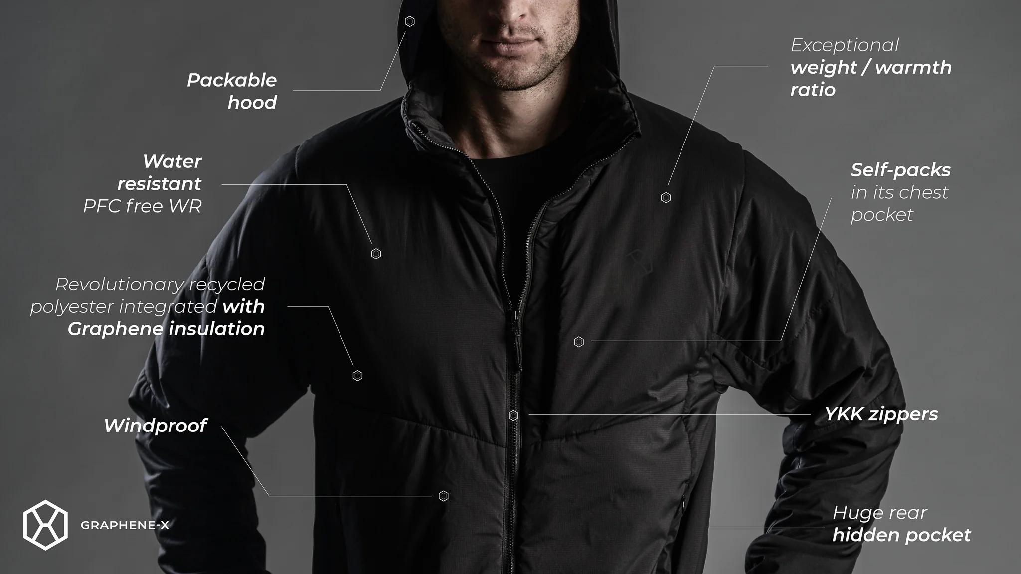 The GRAnaREC Midlayer Jacket redefines insulation. Built with GRAPHINSULATE™, a first-ever graphene-integrated recycled polyester fill, it delivers an unrivaled weight-to-warmth ratio that keeps you warm even when wet. It self-packs into its own chest pocket, making it easy to carry everywhere. Available in 80 g/m² (Black) for colder seasons and 60 g/m² (Ice Grey) for milder climates. With water-resistant PFC-free coating, windproof performance, antibacterial and anti-UV properties, plus abundant storage including a hidden rear pocket and packable hood, the GRAnaREC is the midlayer built for everything from urban nights to unpredictable trails.