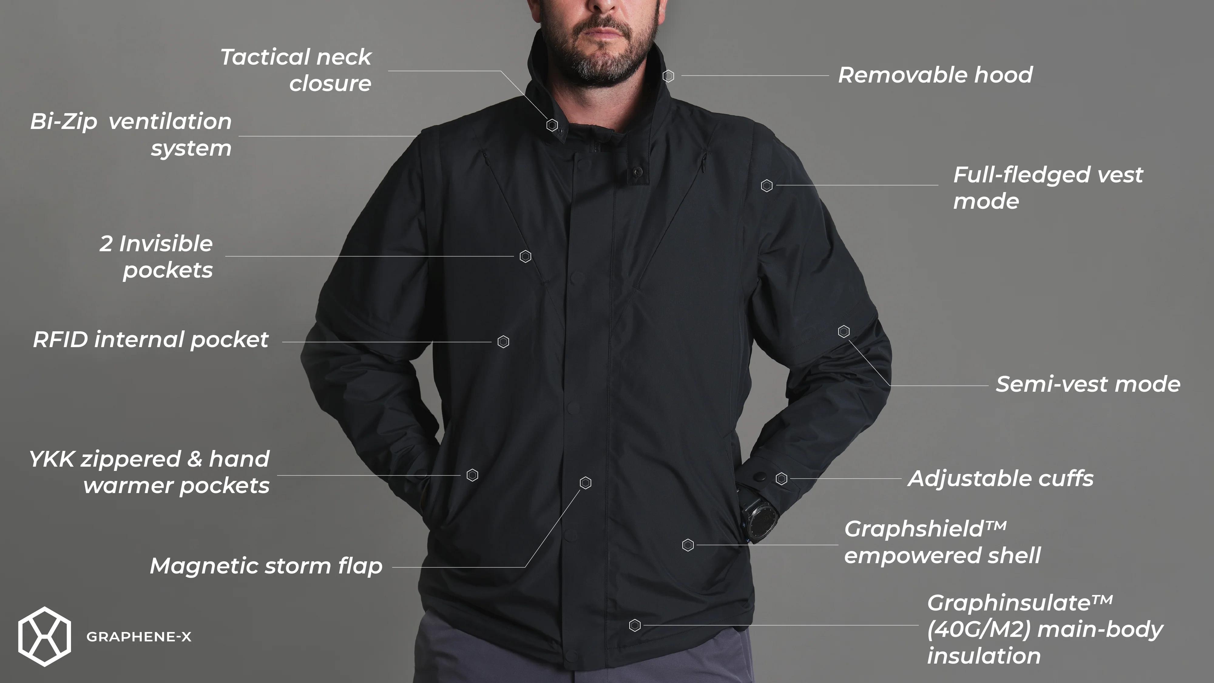 Inspired by NASA spacesuits, the JackVest is a modular 3-in-1 system that transitions from a waterproof adventure jacket to a semi-vest and finally to a full vest. Its shell uses GRAPHTOUGH™ graphene-integrated fabric (10K/10K waterproof-breathable) for strength and weather protection, while the body is insulated with GRAPHINSULATE™ (40 g/m²) fill enhanced with graphene for lightweight warmth and thermoregulation. Storage is mission-ready, with dual invisible pockets, an RFID security pocket, chest pockets, hand warmers, and a dual-access rear pocket that stows detachable sleeves or hood. A Bi-Zip Ventilation System at the back adds active climate control. Built for adaptability, the JackVest is one piece of gear that covers every scenario.