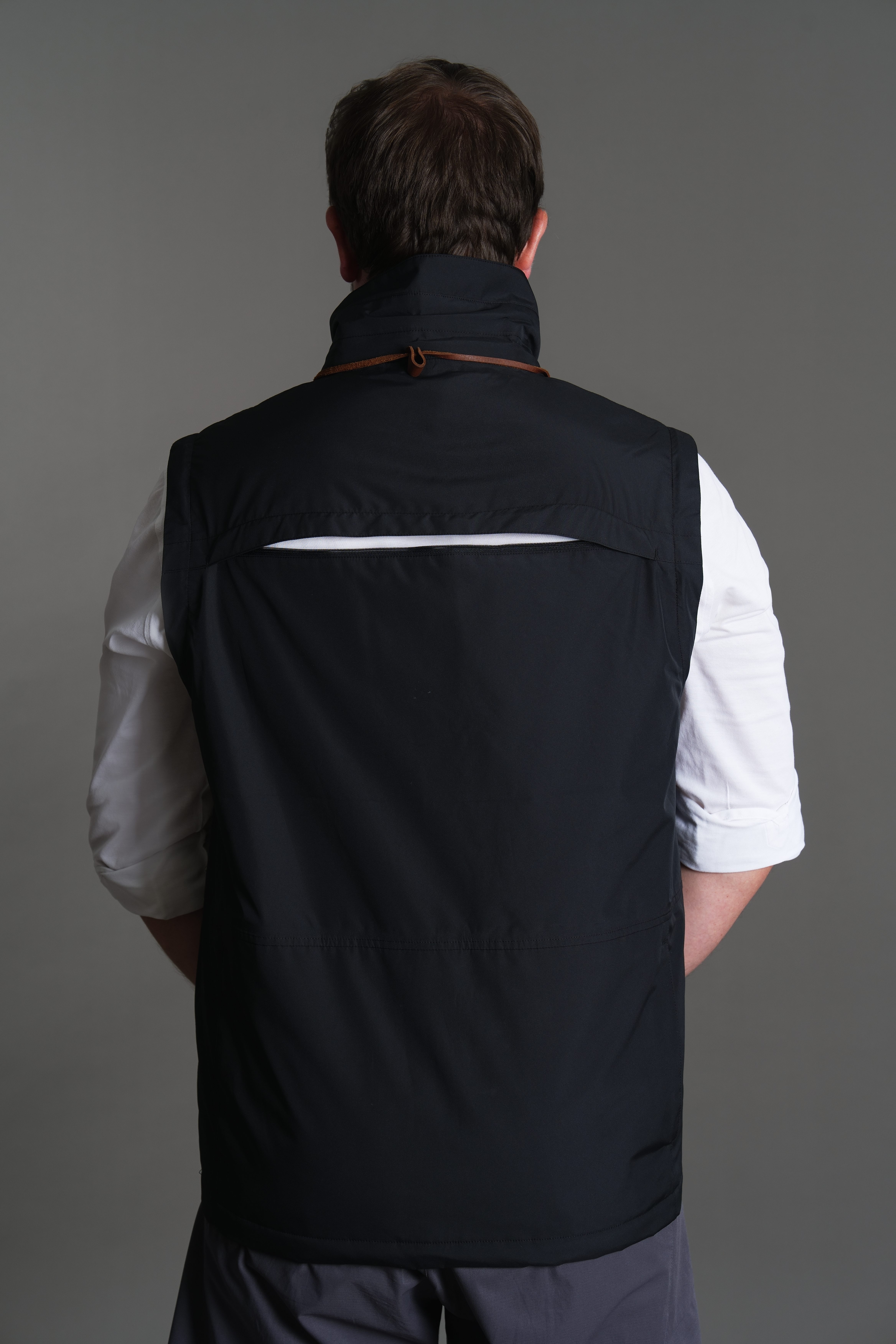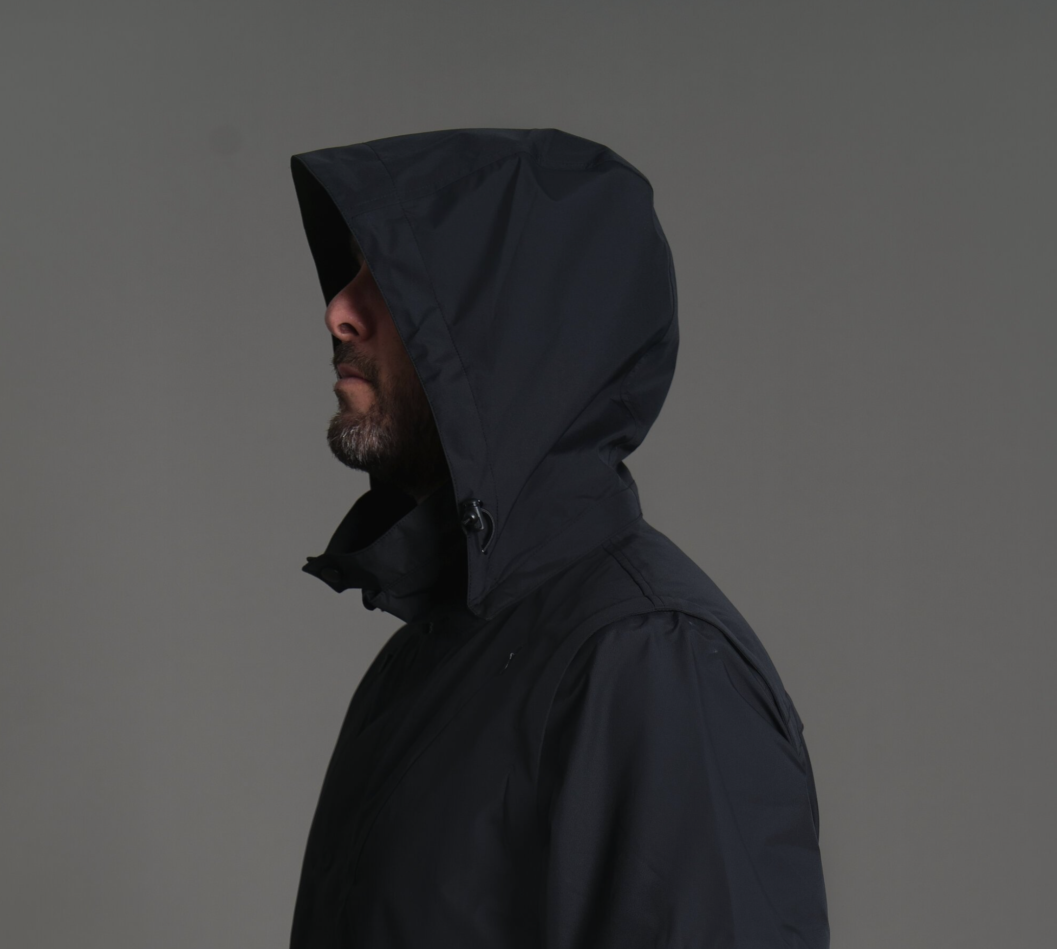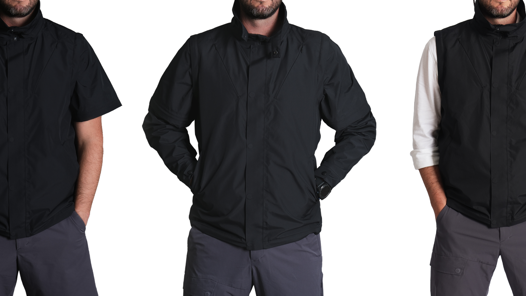 Transitions from full jacket to semi-vest to vest, with stowable sleeves and hood.