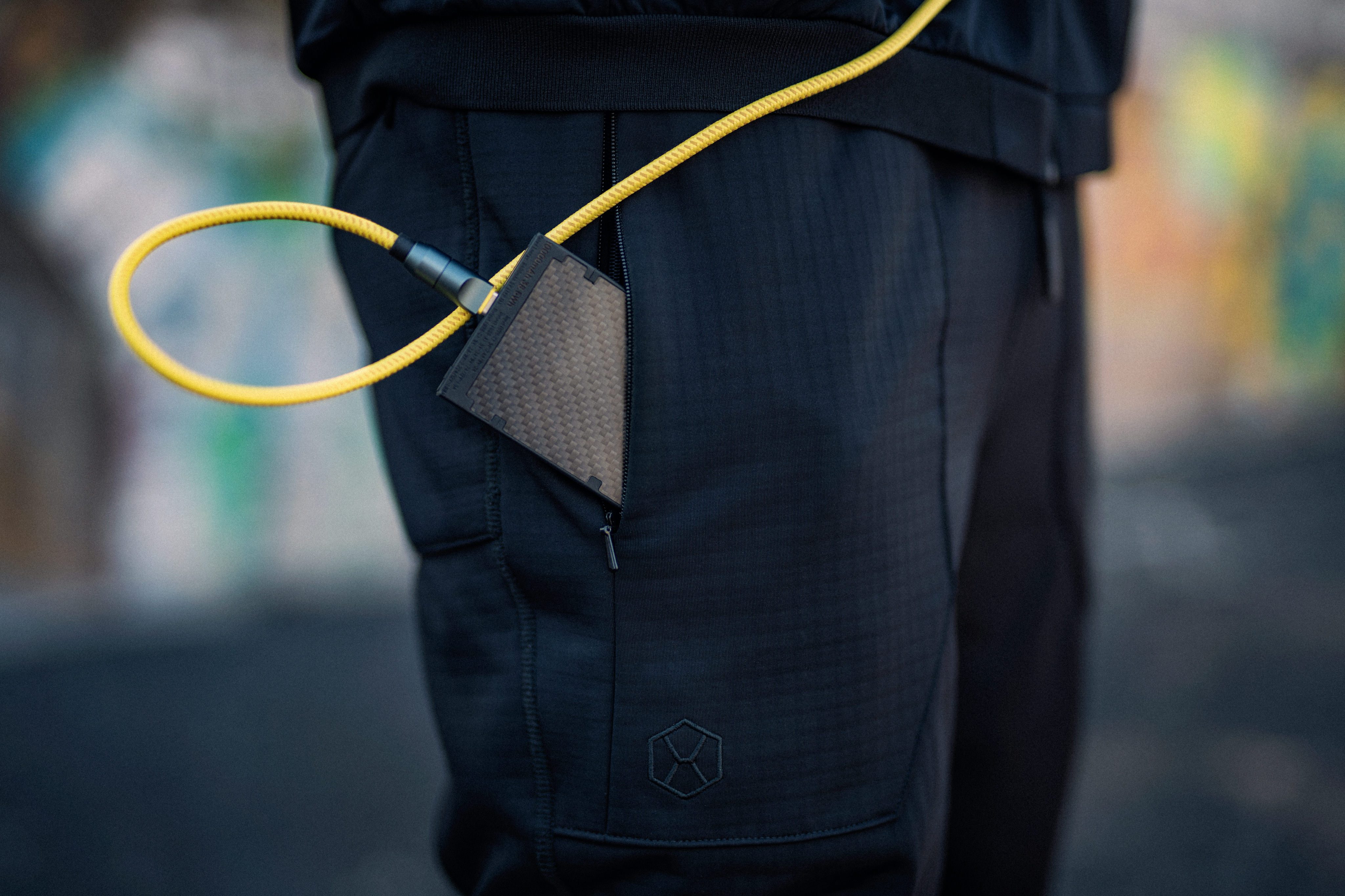 The Reversible Sweatpants feature graphene-integrated grid fleece on one side to retain heat, and a Ruco-therm nylon blend on the flip side to release heat. Between these is a breathable TPU membrane for wind and moisture protection. With three invisible YKK zip pockets, antibacterial and UV-blocking properties, and high durability, these pants adapt to cold and warm environments alike.