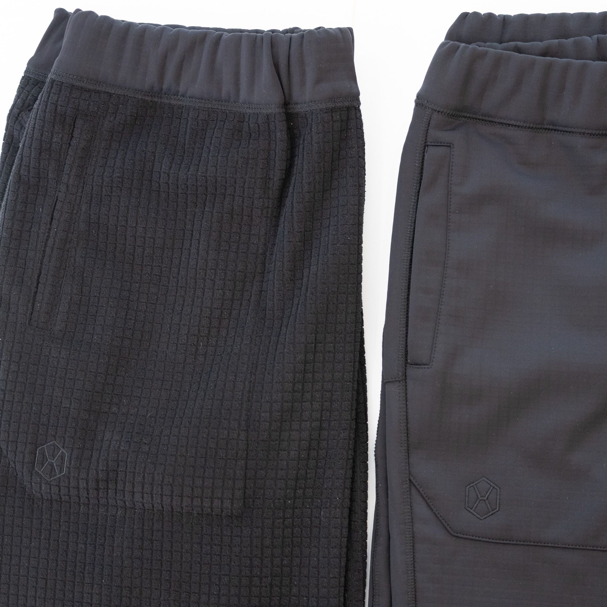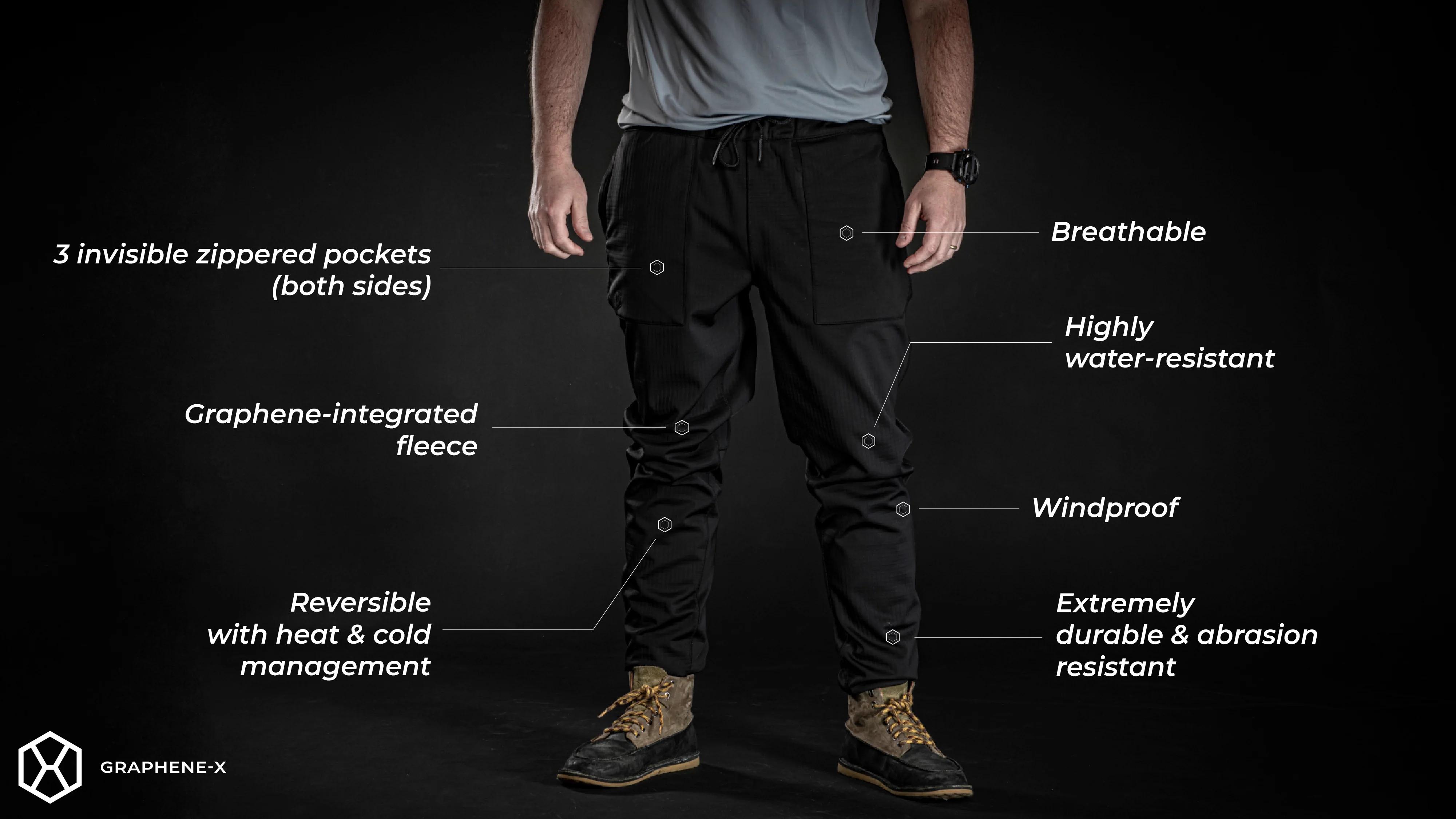 The Reversible Sweatpants feature graphene-integrated grid fleece on one side to retain heat, and a Ruco-therm nylon blend on the flip side to release heat. Between these is a breathable TPU membrane for wind and moisture protection. With three invisible YKK zip pockets, antibacterial and UV-blocking properties, and high durability, these pants adapt to cold and warm environments alike.
