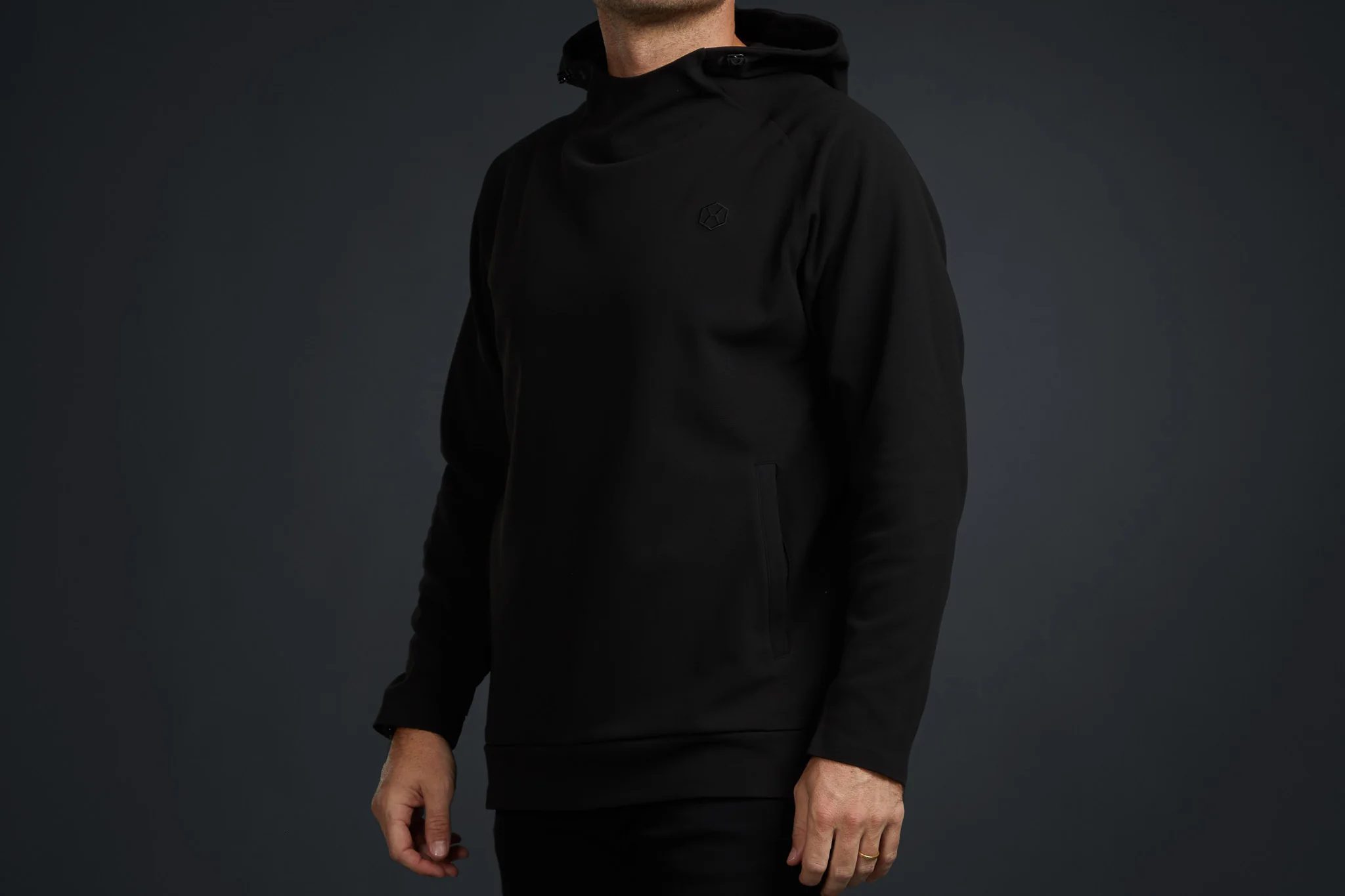 Looks like a classic black hoodie. Runs on next-gen fabrics tech.