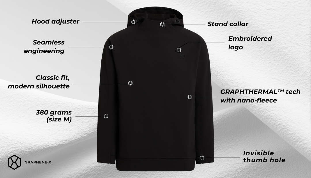 GRAPHTHERMAL™ turns fabric into a heat-control system. Graphene’s high thermal conductivity spreads warmth fast across the surface, killing cold spots, while its far-infrared (FIR) emissivity captures a portion of the FIR your body naturally emits and re-radiates it back as gentle heat. We pair that engine with an ultra-soft nano fleece on the inside—so the warmth feels immediate and low-friction—and a tough-as-nails outer face that shrugs off daily wear. The net effect is efficient, low-bulk warmth that holds a steady micro-climate next to skin as conditions shift. Not light. Not heavy. Just right.